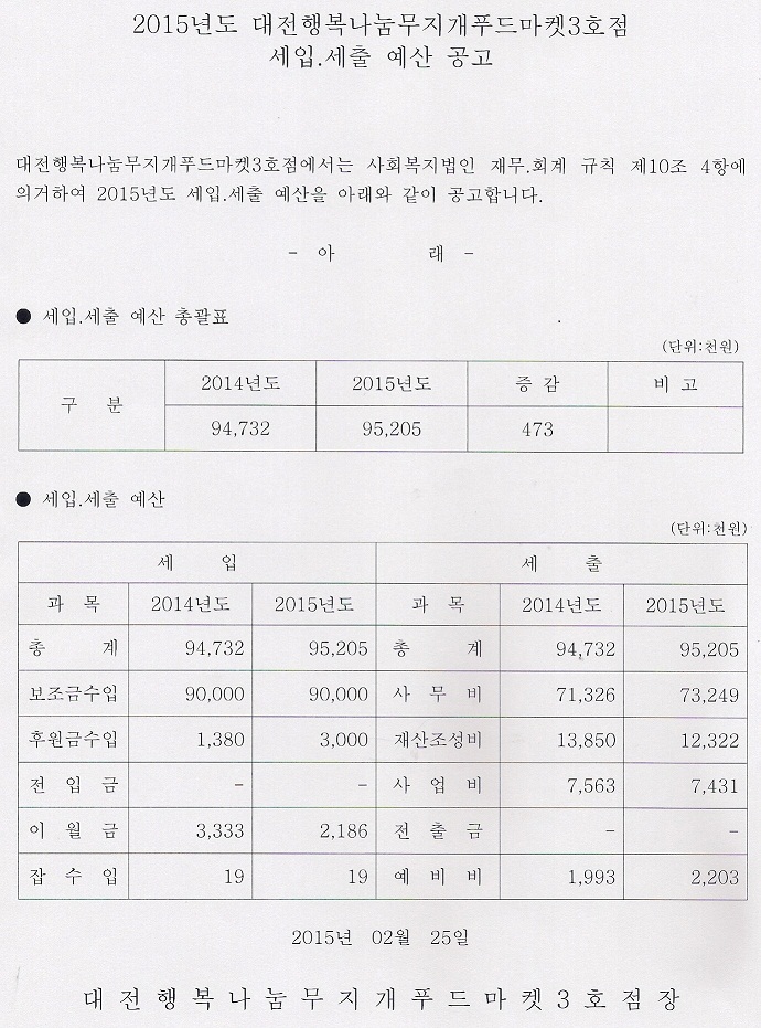 대전행복나눔무지개푸드마켓3호점 2015년도 세입.세출 예산 공고 작성일 19-03-28 11:04 페이지 정보 작성자성우보육원 조회 6,577회 댓글 0건 본문 대전행복나눔무지개푸드마켓3호점 2015년도 세입.세출 에산 공고 댓글목록 댓글목록 등록된 댓글이 없습니다.