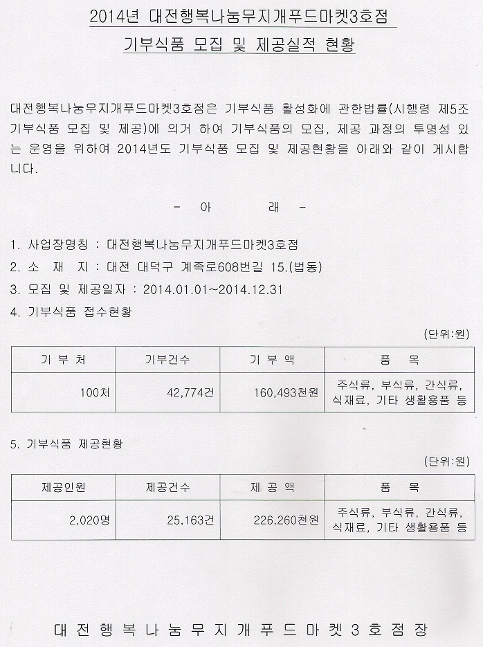 19-03-28 11:04 2014년도 대전행복나눔무지개푸드마켓3호점 기부식품 모집 및 제공실적 공고 페이지 정보 작성자 성우보육원 댓글 0건 조회 6,899회 본문 2014년도 대전행복나눔무지개푸드마켓3호점 기부식품 모집 및 제공실적 공고 목록 댓글목록 댓글목록 등록된 댓글이 없습니다.
