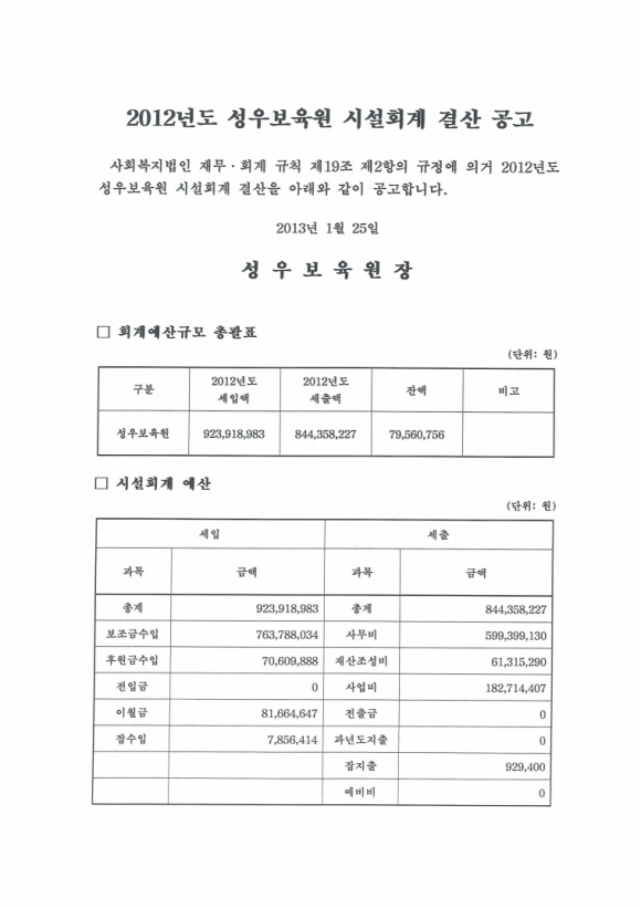 2012년도 성우보육원 시설회계 결산공고 > 공지사항