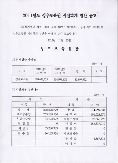 19-03-28 10:51 2011년도 성우보육원 시설회계 결산 공고 페이지 정보 작성자 성우보육원 댓글 0건 조회 7,901회 본문 2011년도 성우보육원 시설회계 결산 공고 목록 댓글목록 댓글목록 등록된 댓글이 없습니다.
