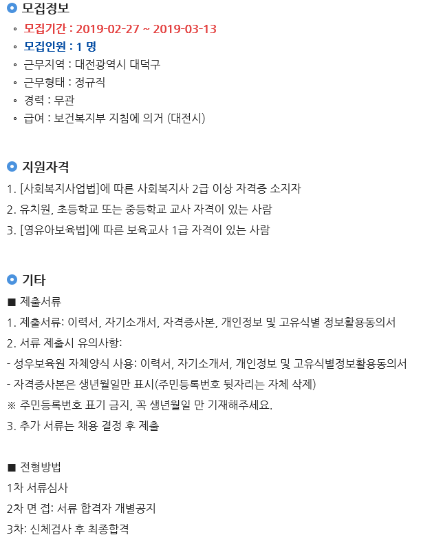 19-02-27 11:49 (공고) 생활지도원 모집 페이지 정보 작성자 성우보육원 댓글 0건 조회 8,085회 본문 생활지도원 모집관련, 복지넷 공고(공고번호: 493833)참고해주세요. 목록 댓글목록 댓글목록 등록된 댓글이 없습니다.