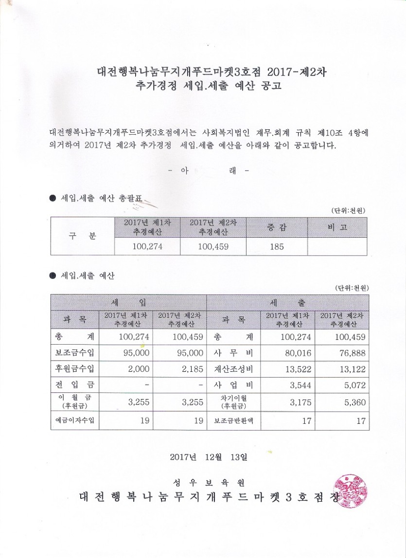 19-03-28 11:41 (재공고)대전행복나눔무지개푸드마켓3호점 2017-2차 세입.세출 추가경정 예산공고 페이지 정보 작성자 성우보육원 댓글 0건 조회 7,440회 본문 (재공고)대전행복나눔무지개푸드마켓3호점 2017-2차 세입.세출 추가경정 예산공고 목록 댓글목록 댓글목록 등록된 댓글이 없습니다.
