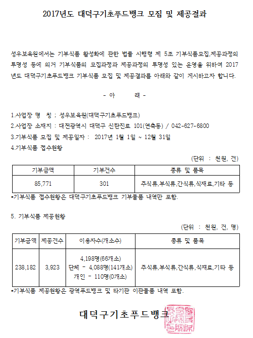 2017년도 대덕구기초푸드뱅크 모집 및 제공결과 작성일 19-03-28 11:43 페이지 정보 작성자성우보육원 조회 7,326회 댓글 0건 본문 2017년도 대덕구기초푸드뱅크 모집 및 제공결과 댓글목록 댓글목록 등록된 댓글이 없습니다.