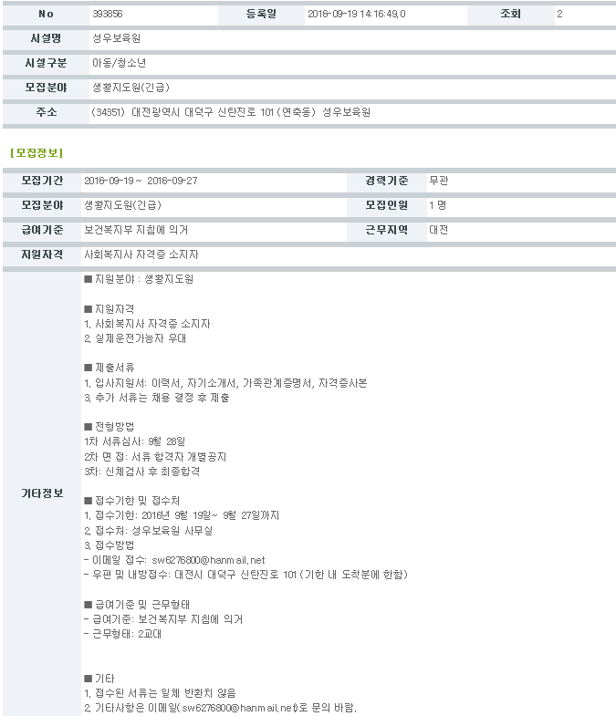 (채용공고)생활지도원 모집 작성일 19-03-28 11:32 페이지 정보 작성자성우보육원 조회 8,133회 댓글 0건 본문 생활지도원 모집 댓글목록 댓글목록 등록된 댓글이 없습니다.
