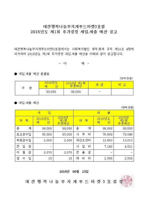 19-03-28 11:32 행복나눔무지개푸드마켓3호점 2016년도 제1회 추가경정 세입.세출 예산공고 페이지 정보 작성자 성우보육원 댓글 0건 조회 8,168회 본문 행복나눔무지개푸드마켓3호점 2016년도 제1회 추가경정 세입.세출 예산공고 목록 댓글목록 댓글목록 등록된 댓글이 없습니다.