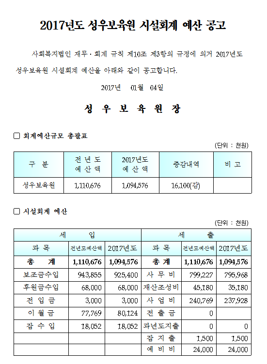 19-03-28 11:35 2017년 성우보육원 시설회계 예산 공고 페이지 정보 작성자 성우보육원 댓글 0건 조회 7,844회 본문 2017년 성우보육원 시설회계 예산 공고 목록 댓글목록 댓글목록 등록된 댓글이 없습니다.