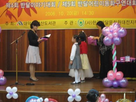 2006.10.22 10월 20일 반달이야기 대회 페이지 정보 작성자 성우보육원 댓글 0건 조회 2,173회 본문 10월20일(금요일)반달 동화구연이 안산도서관 시청각실 1층에서 있었습니다. 목록 댓글목록 댓글목록 등록된 댓글이 없습니다.