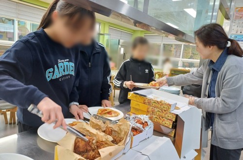 매니아푸드에서 맛있는 피자와 치킨을 저녁 식사로 후원해 주셨습니다. 배식대에 놓…